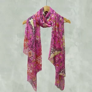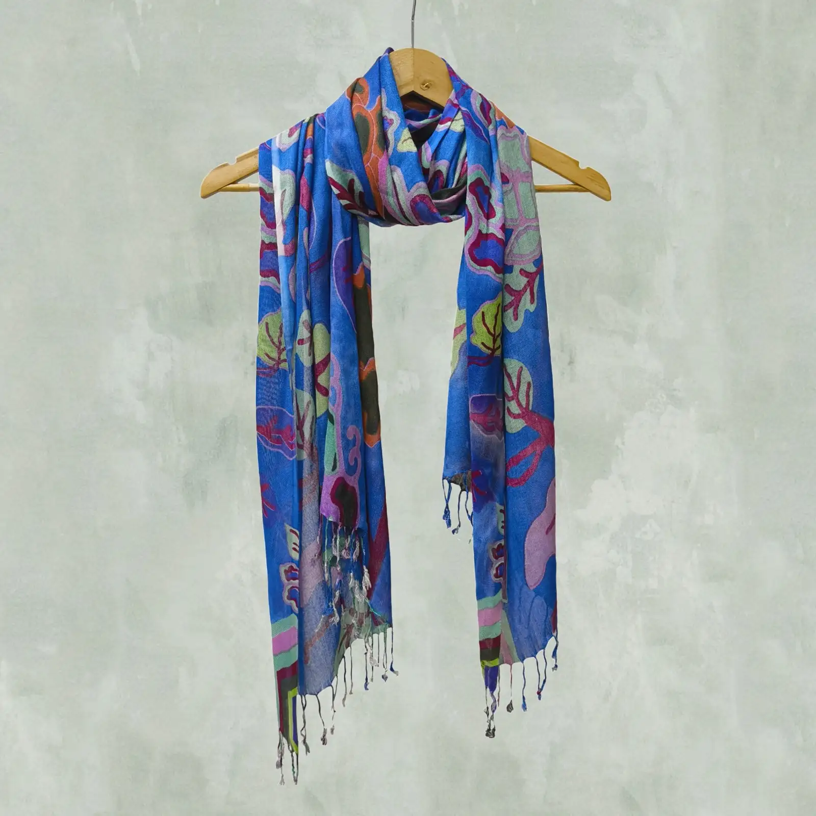A bold and colorful abstract scarf in shades of blue, pink, and green. Perfect for artistic and vibrant personalities.