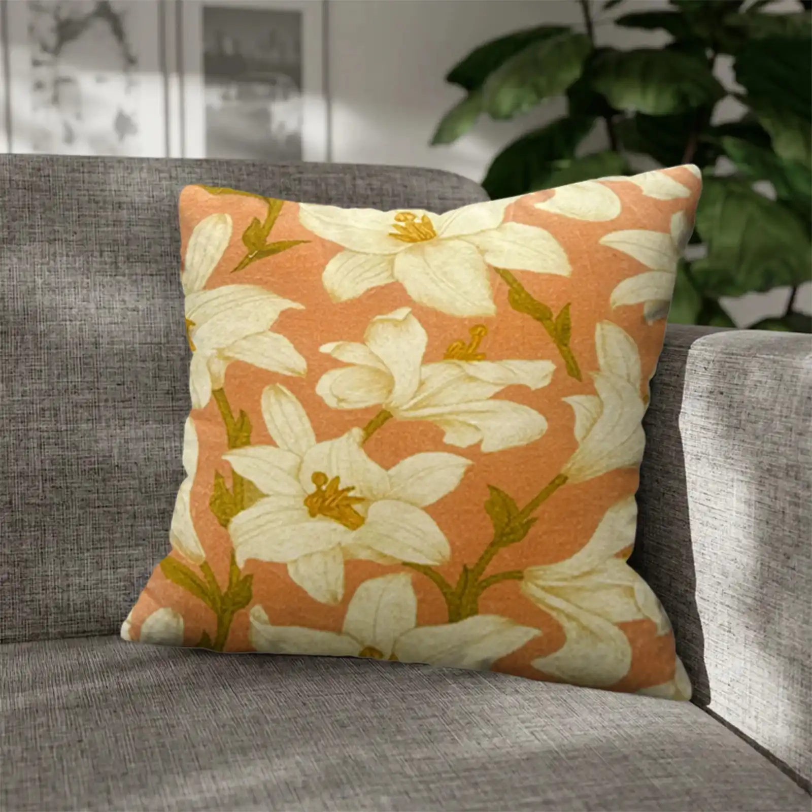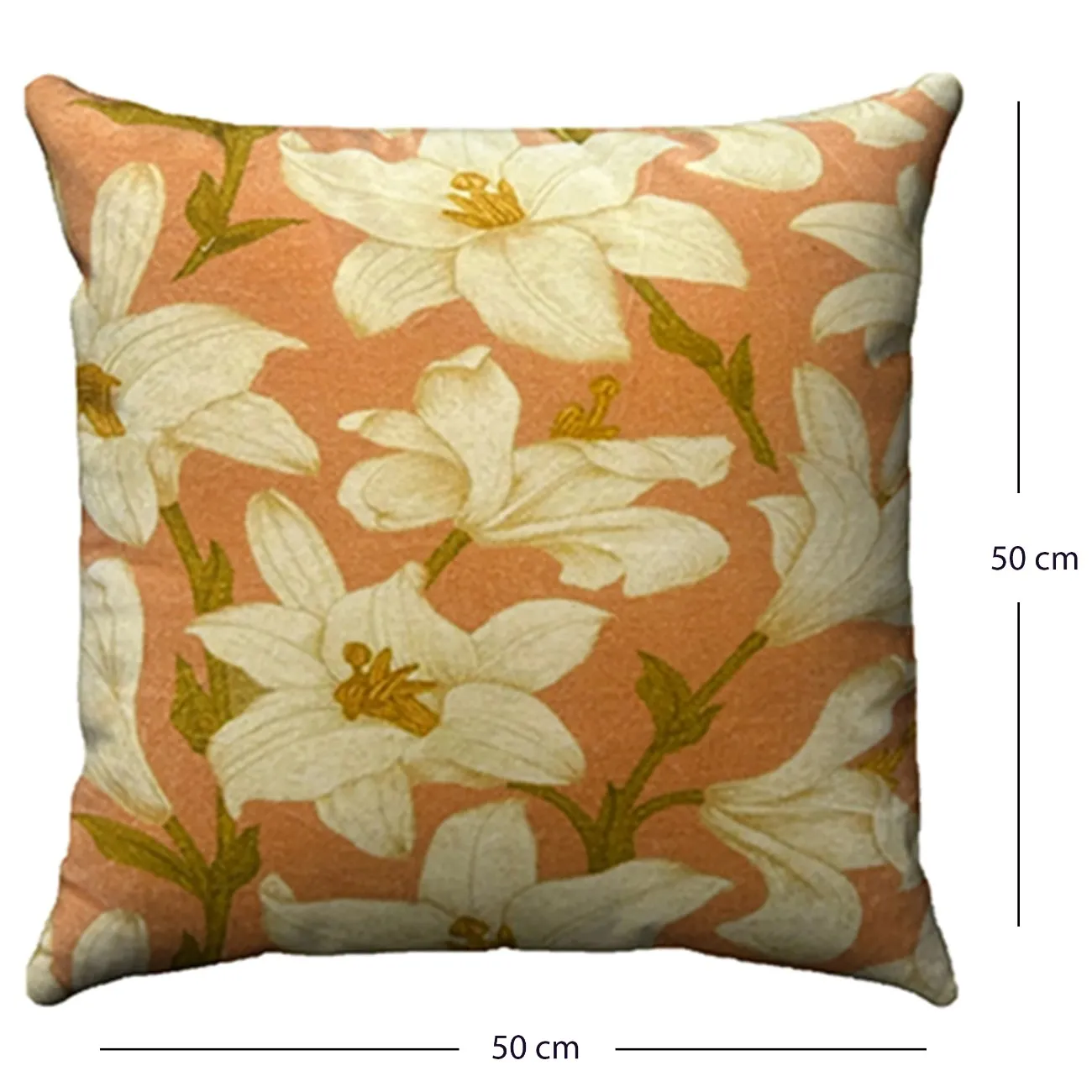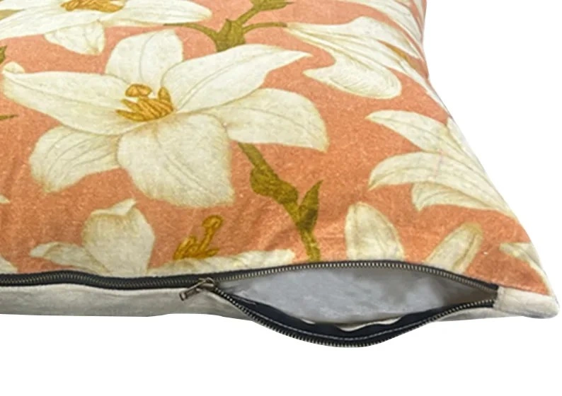 Bring a fresh, floral vibe to your space with this peach-colored cushion cover adorned with elegant white lilies. Crafted from soft cotton velvet, it combines comfort with vibrant style-perfect for enhancing living rooms, bedrooms, or balconies with a touch of natural charm.