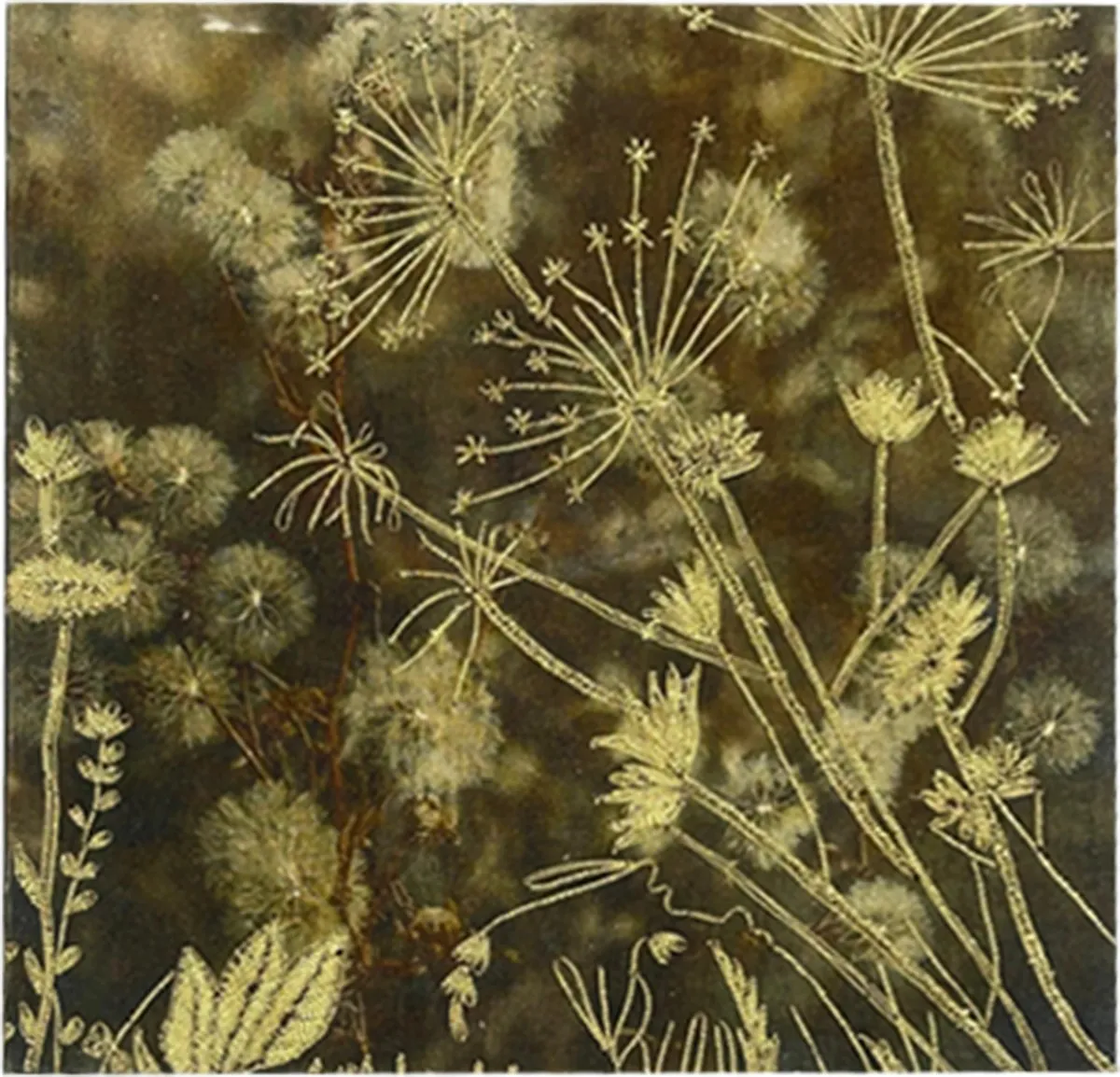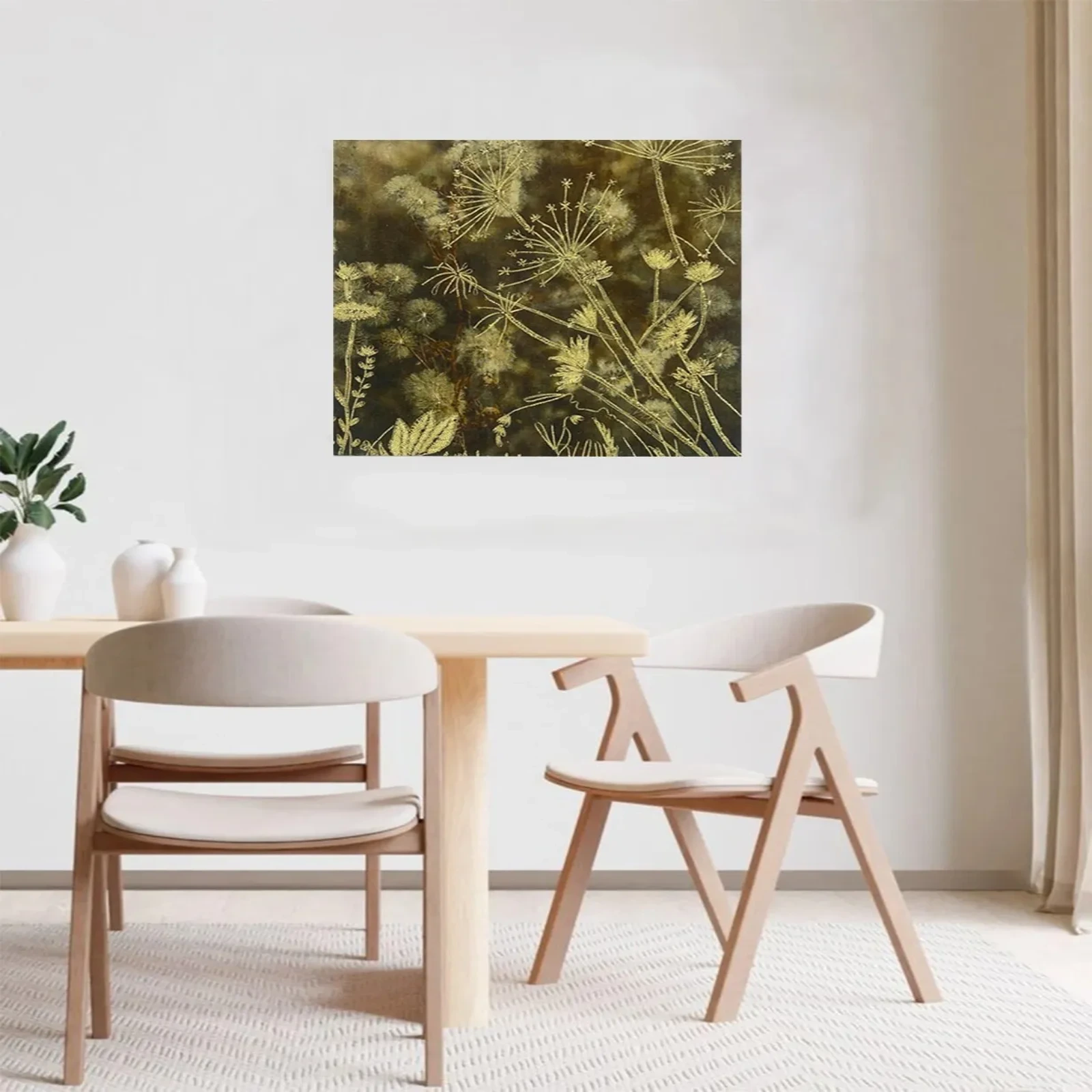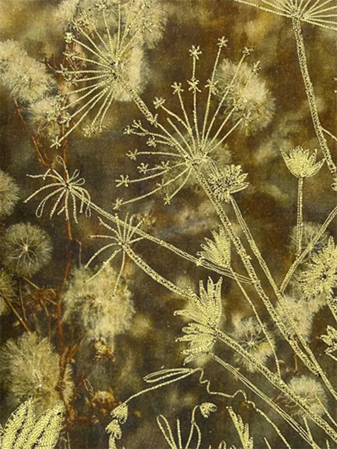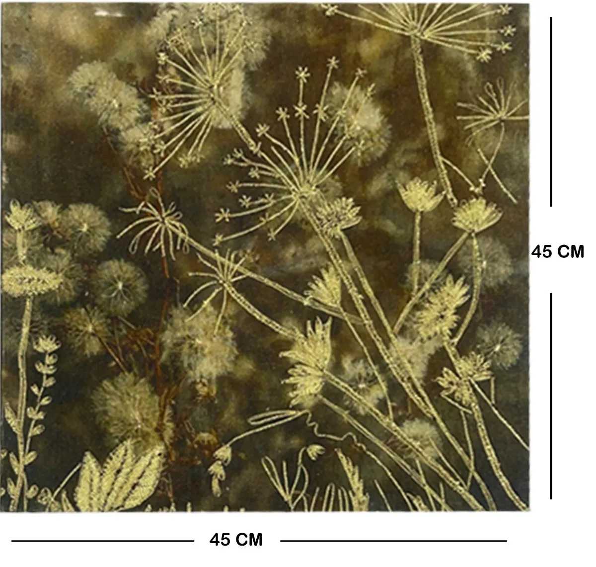 Elegant botanical wall art with intricate golden floral embroidery on a rich textured base. A classy statement piece for any wall.