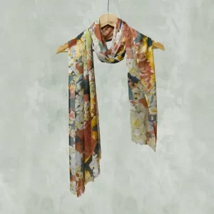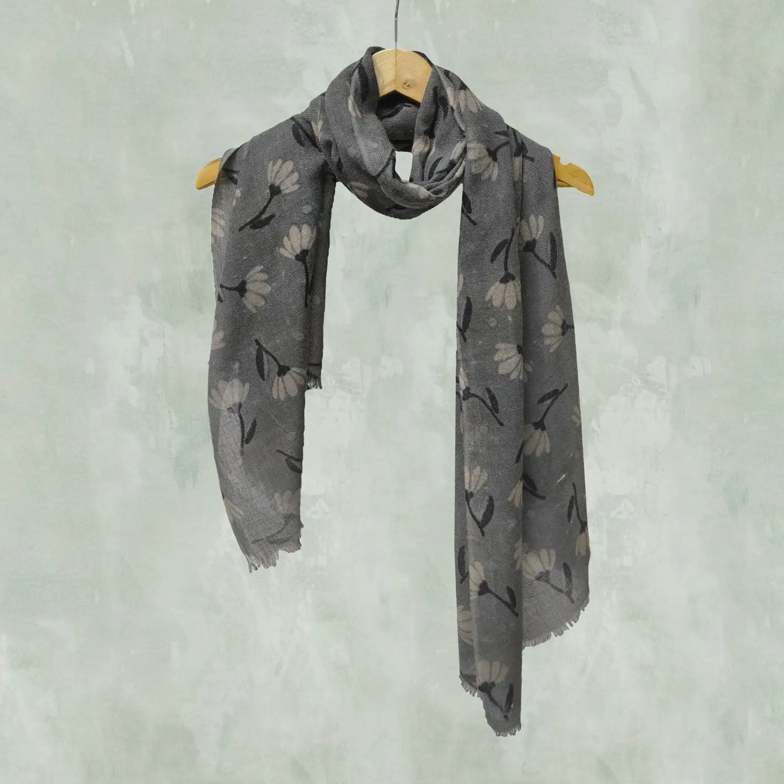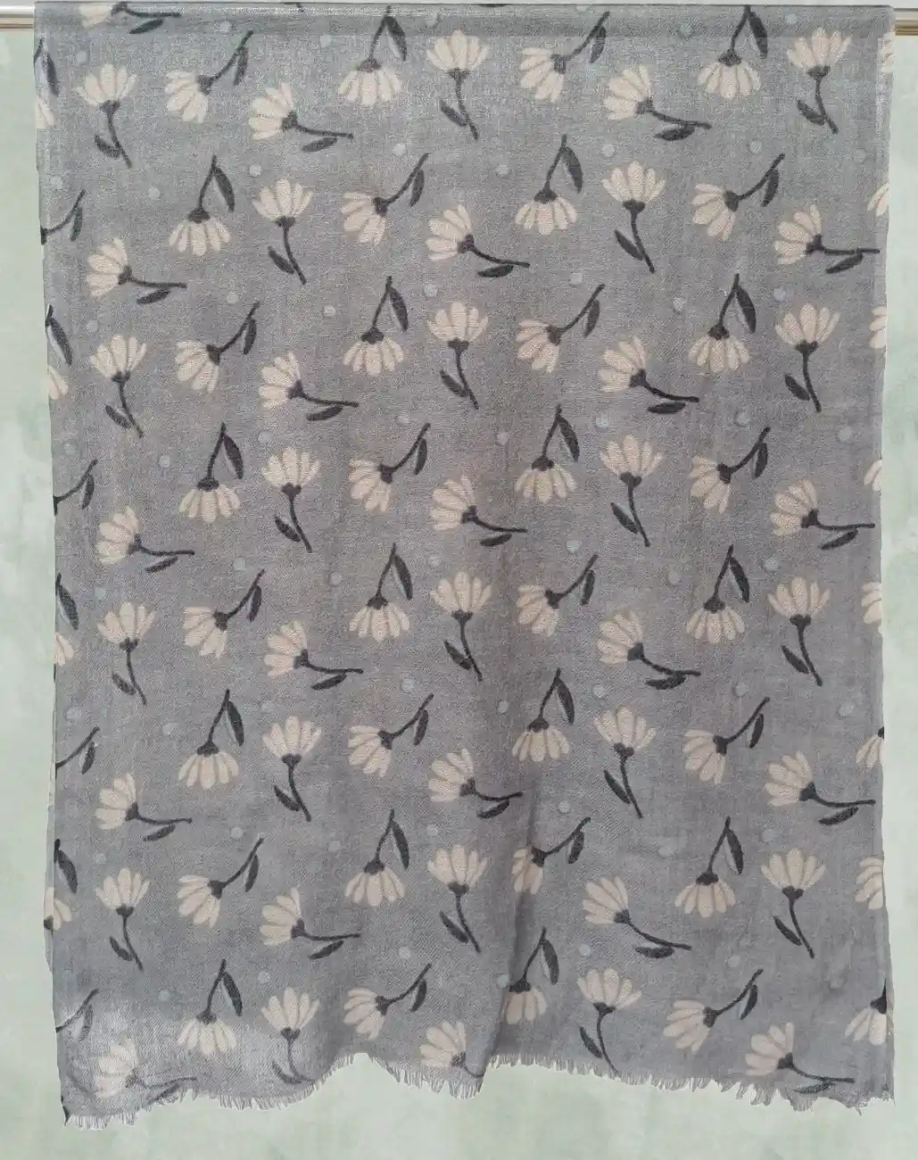Stylish and feminine, this scarf features subtle floral daisy prints on a soft brey base. A perfect balance of elegance and charm.