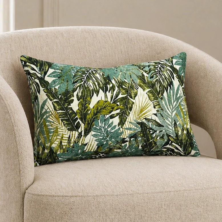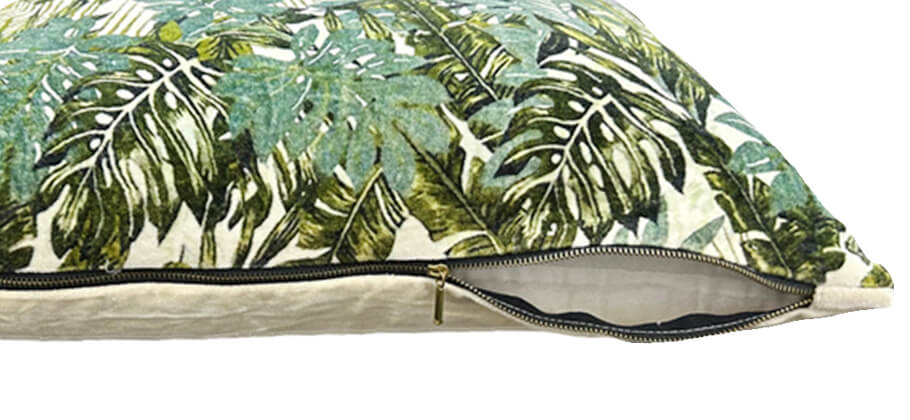 Add a touch of nature to your space with this lush tropical print cushion cover. Crafted from soft velvet, its Features a vibrant jungle leaf design on the front and a plain beige velvet back-perfect far reversible styling.