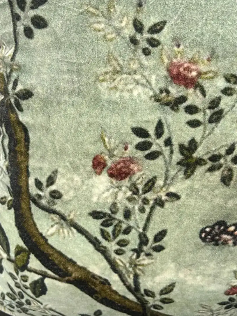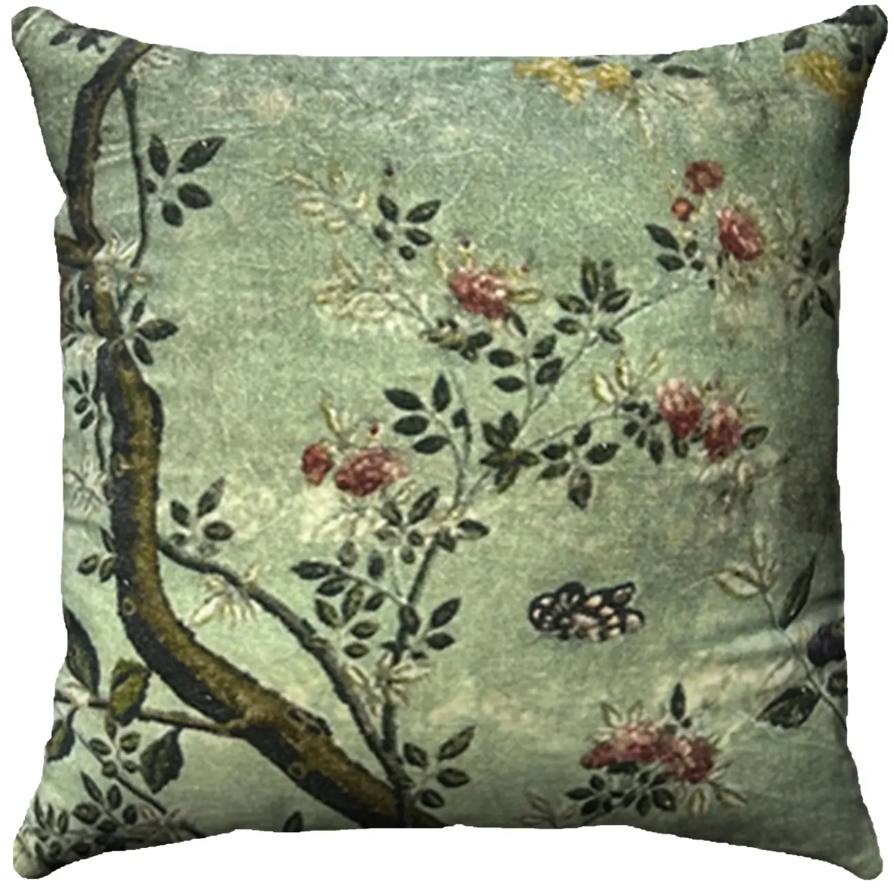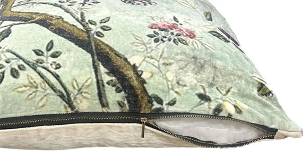 A vintage-inspired design featuring delicate flowers and tree branches on a serene green base. Soft velvety texture adds comfort and classic style.